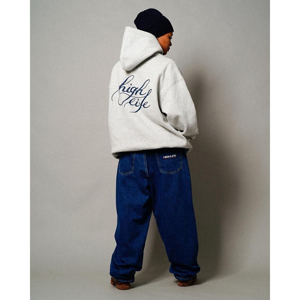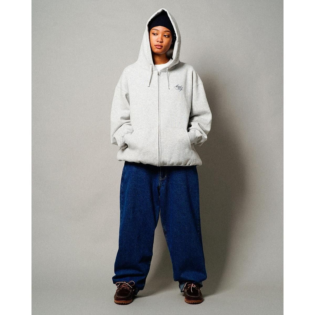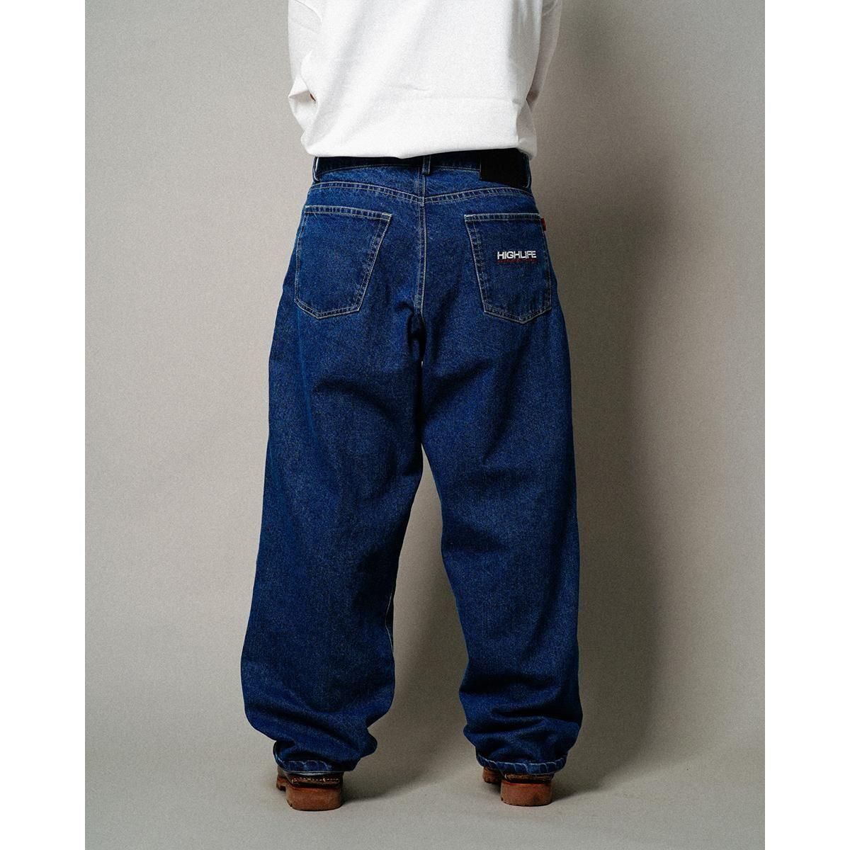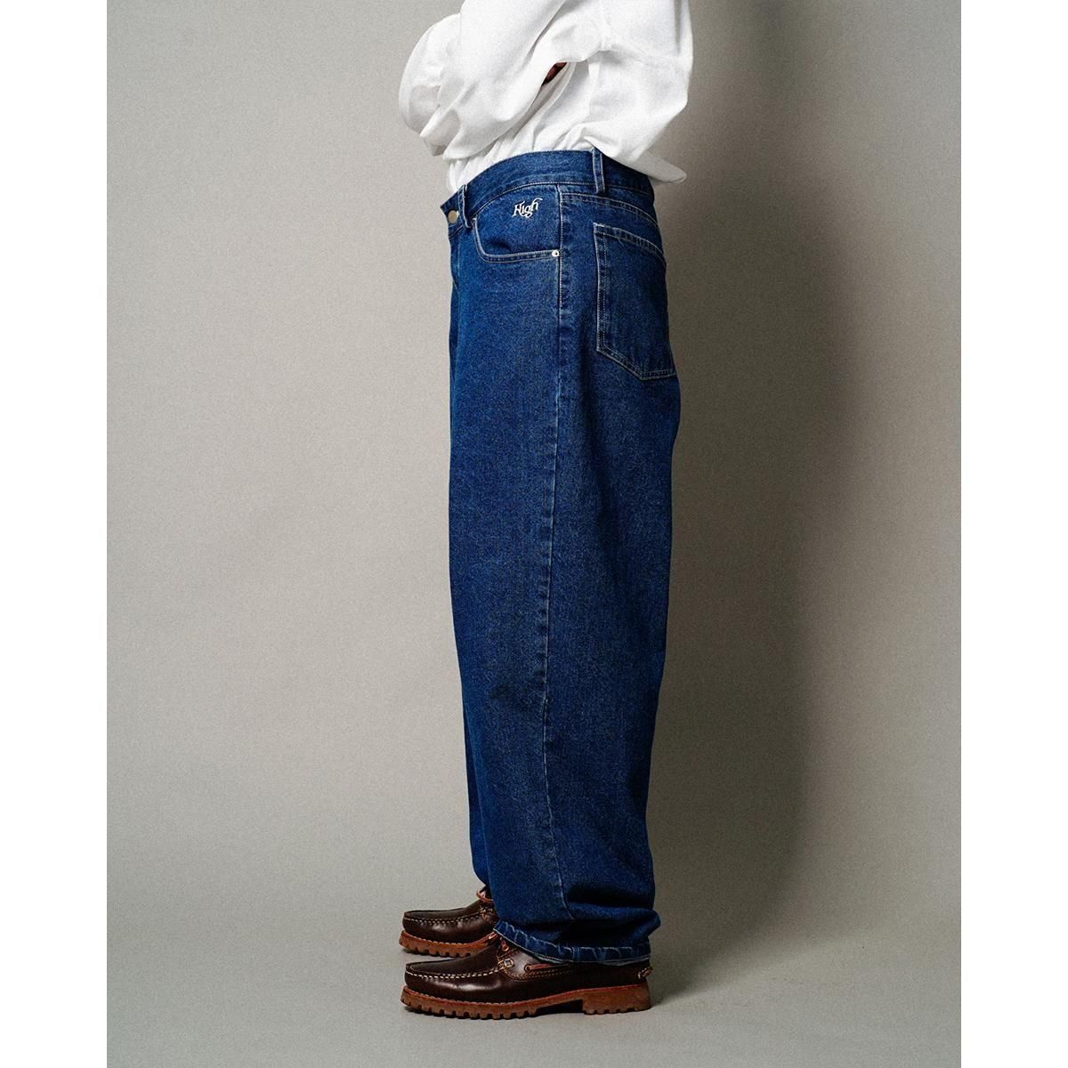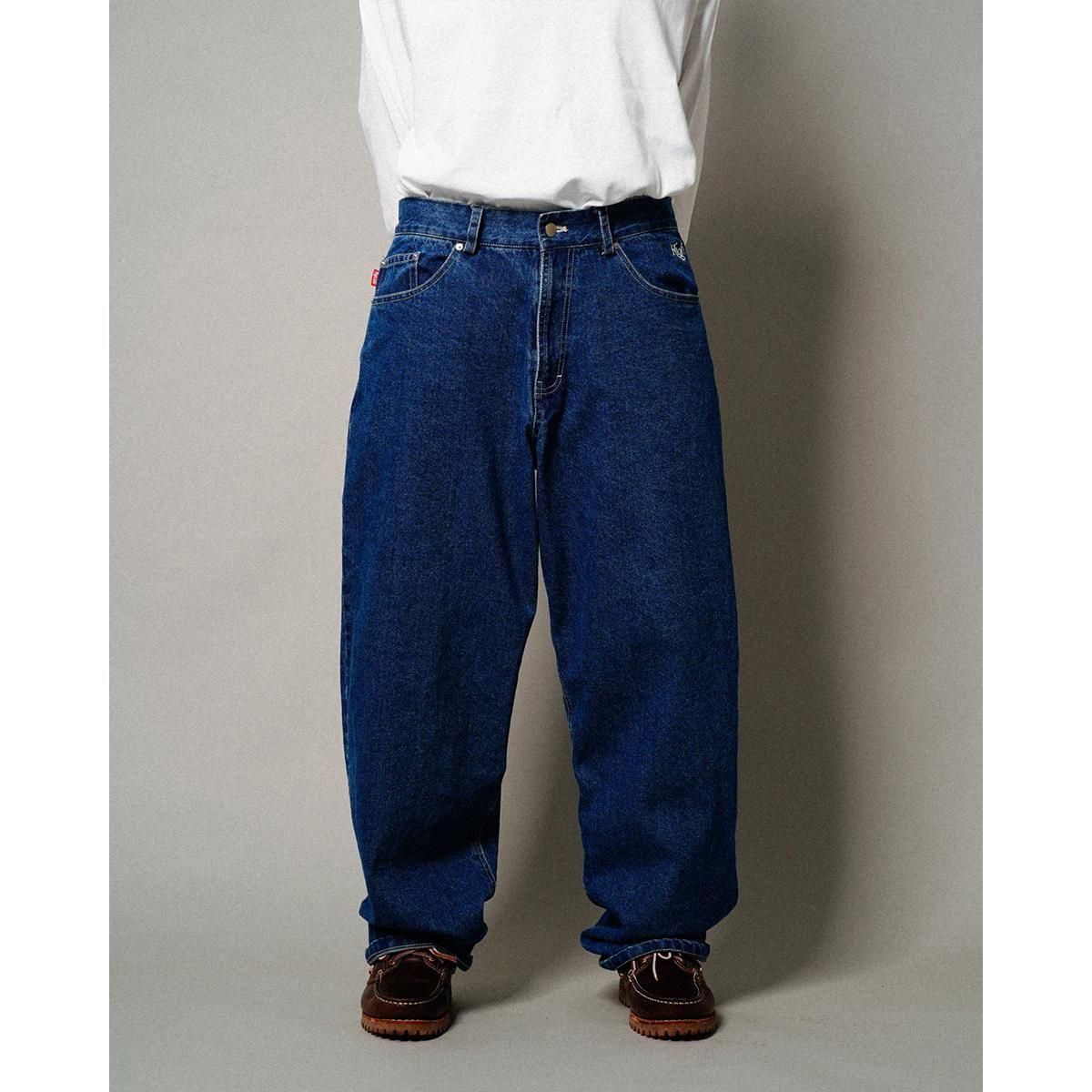 ルーズなワイドシルエットで、リラックス感のあるバギーテーパードジーンズ。ウォッシュ加工を施した肉厚のデニム素材を使用したストリート感のあるゆったりとしたシルエットが特徴。ベルトループ仕様のレザーパッチにロゴを型押し、右コインポケットにピスネームを配置、左ポケットと後ろポケットに刺繍を施す。